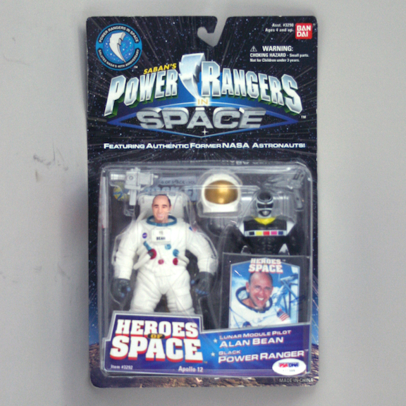 Description:Alan Bean twice-signed unopened Power Rangers astronauts package PSA/DNA. (VG/EX-EX) Bean signed the facing and the top panel of the package in blue marker. Signatures rate 6 out of 10. PSA/DNA serial #ed sticker is affixed. Package exhibits light to moderate wear, with a few creases present: VG/EX-EX