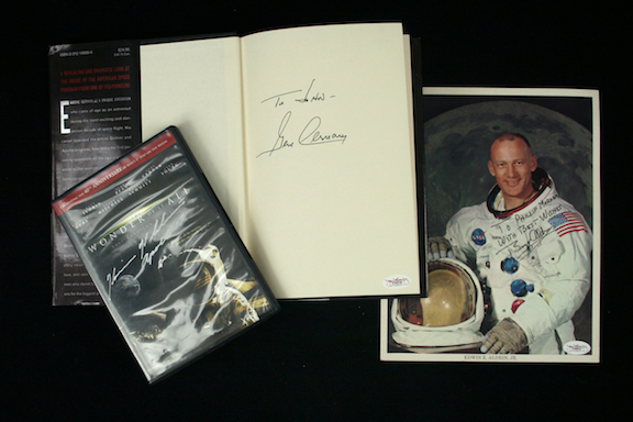 Description:Lot of (3) Astronaut signed items JSA. (EX/MT-NM) Incl. 8"x10" photo signed by Buzz Aldrin (personalized); 1999 "The Last Man On The Moon" hardcover book signed by Gene Cernan (personalized); and "The Wonder Of It All" dvd signed by Harrison Schmitt. Signatures rate 9 to 9/10 out of 10. Each comes with COA from JSA (serial #ed stickers are affixed): EX/MT-NM