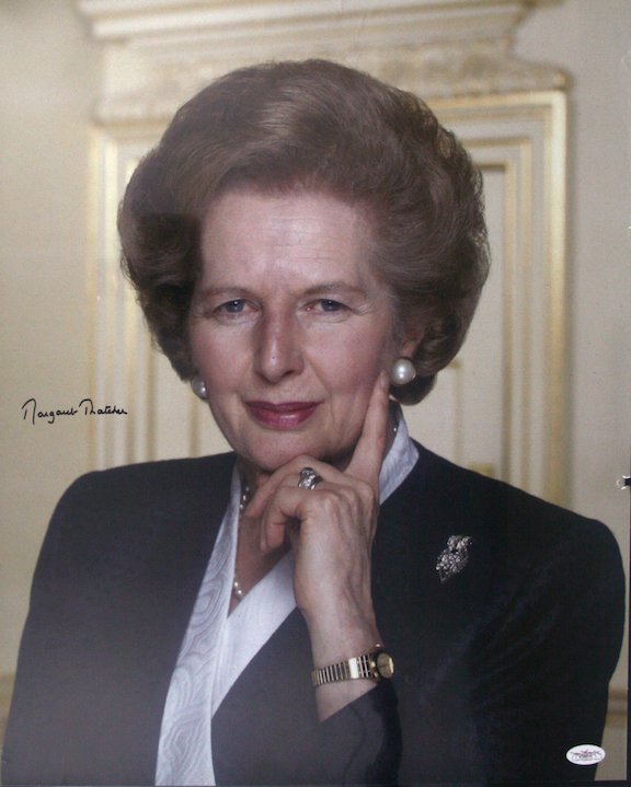 Description:Margaret Thatcher signed 16"x20" photograph JSA. (VG-VG/EX) Thatcher signed the photo in black marker. Signature rates 9 out of 10. Comes with COA from JSA (serial #ed sticker is affixed). Photo has a small tear along the right edge: VG-VG/EX