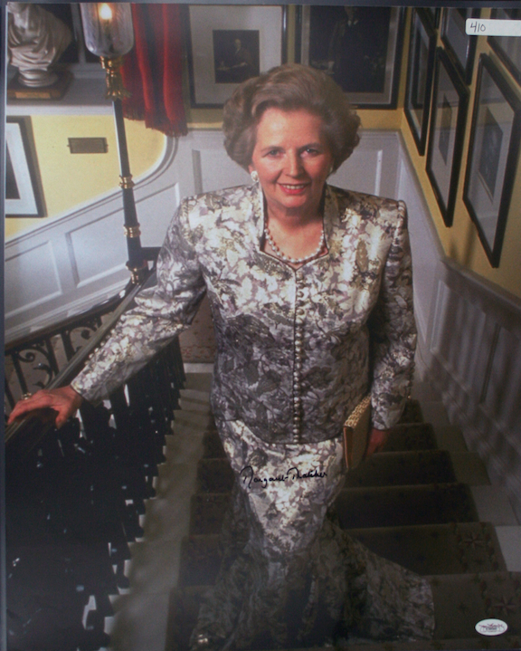 Description:Margaret Thatcher signed 16"x20" photograph JSA. (EX/MT-NM) Thatcher signed the photo in black marker. Signature rates 9 out of 10. JSA serial #ed sticker is affixed: EX/MT-NM