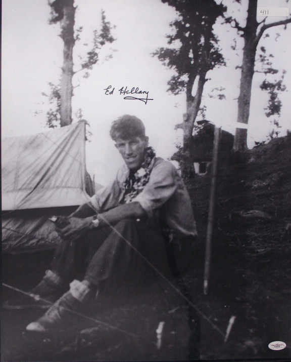 Description:Sir Edmund Hillary signed 16"x20" photograph JSA. (EX/MT-NM) Hillary signed the photo "Ed Hillary" in black marker. Signature rates 9 out of 10. JSA serial #ed sticker is affixed: EX/MT-NM