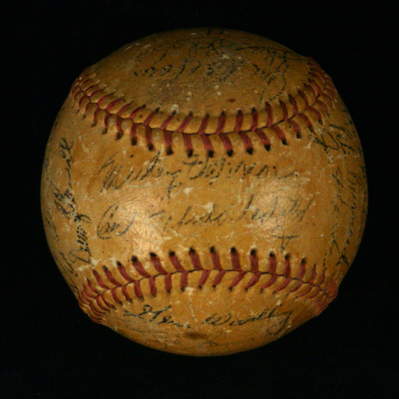 Description:1962 Washington Senators partial team-signed baseball. (VG-VG/EX) Unlabeled ball signed by (30) members of the 1962 Senators including Jimmy Piersall, Gene Woodling, Claude Osteen, Sid Hudson, Mickey Vernon, Ed Brinkman, and others. Signatures rate 2/3 to 6 (avg 4/5) out of 10. Ball has been shellacked and exhibits moderate surface wear: VG-VG/EX