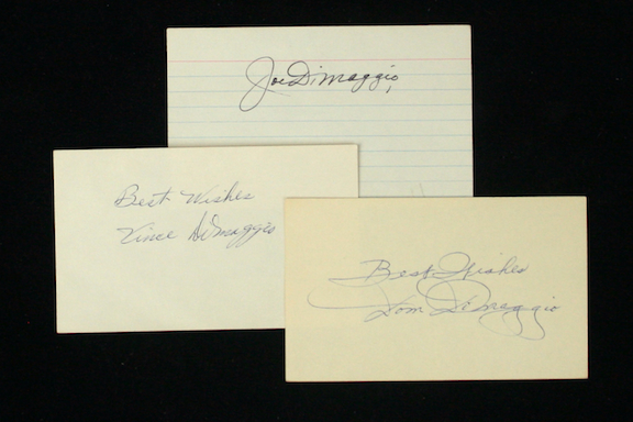 Description:Joe DiMaggio, Dom DiMaggio, and Vince DiMaggio single-signed index cards. (EX-NM) Incl. index card signed by Joe DiMaggio in black ink; Index card signed by Dom DiMaggio in blue ink with "Best Wishes" inscription; and an index card signed by Vince DiMaggio in blue ink with "Best Wishes" inscription. Signatures rate 9 to 9/10 out of 10. Index cards show light to moderate handling wear: EX-NM