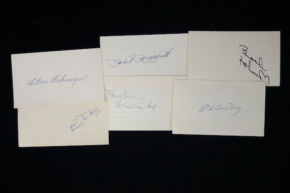 Description:Lot of (13) Baseball HOFer signed index cards, with deceased. (EX-NM) Incl. Bill Dickey, Charlie Gehringer, Burleigh Grimes, "Schoolboy" Hoyt, Carl Hubbell, Hal Newhouser, Phil Rizzuto, Bill Terry, Yogi Berra, Bob Feller, Ralph Kiner, Jim Rice, and Brooks Robinson. Signatures rate 8 to 9/10 out of 10. Index cards show light to moderate handling wear: EX-NM