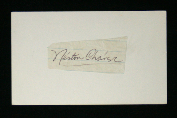 Description:Nestor Chavez (d.1969) signed cut affixed to index card. (EX) Paper cut signed by Chavez in black ink. Signature rates 9 out of 10. Cut is affixed to a 3"x5" index card, which shows light to moderate handling wear: EX