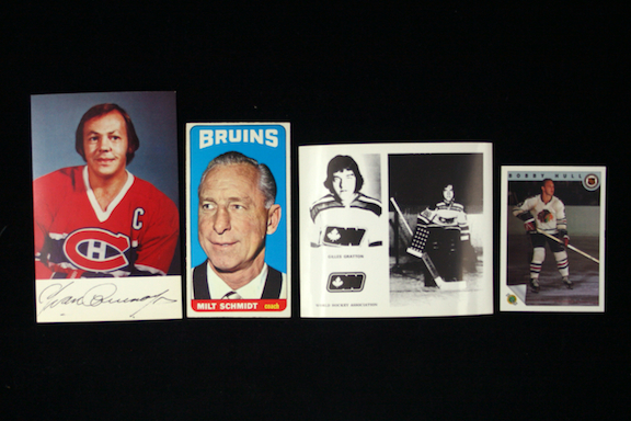 Description:Lot of approx. (300) hockey cards from 1964-1990s, with HOFers. (PR-NM) Incl. (5) 1964-65 Topps with #s 22 Denis DeJordy (VG), 26 Al MacNeil (VG), 29 Red Sullivan (VG), (2) 70 Milt Schmidt (PR-VG/EX); 1972-73 Ottawa Nationals (23) card photo set (VG-EX/MT); 1973-74 OPC (20) poster set (VG/EX-EX/MT, still folded); 1978-79 Montreal Canadiens (26) card photo set (VG-EX/MT); 1992 Ultimate Original Six (100) card set (EX/MT-NM overall, range: VG-NM). Remainder appear to grade EX-EX/MT overall. Range: PR-NM