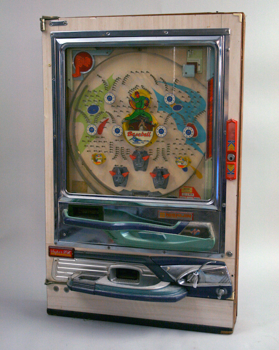 Description:Japanese baseball pinball machine by Nishijin, c.1960s-70s. (EX appearance) 4"x20.5"x32" wooden cased machine features a colorful baseball pitcher on the interior surrounded by a pachinko style game. Does not appear to be in working order, as there are unattached wires present, and it is missing the key. Exterior casing exhibits typical surface wear with areas of soiling and light scratching: EX appearance
