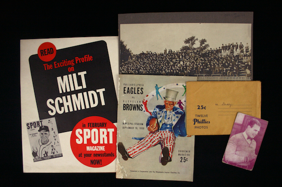 Description:Lot of assorted vintage sports memorabilia, c.1908-1956. (FR-EX/MT) Incl. 8"x13.5" c.1908-09 photo depicting a crowd in the stands watching a game (VG due to tear, affixed to backing); c.1926 "One Minute To Play" Red Grange Exhibits card (FR); Sept 16th 1950 program from game between the Philadelphia Eagles vs Cleveland Browns (VG); 11"x14" 1953 Sport magazine advertising sign (VG/EX); and 1956 Philadelphia Phillies (12) photo pack with original envelope (VG-EX/MT). Range: FR-EX/MT