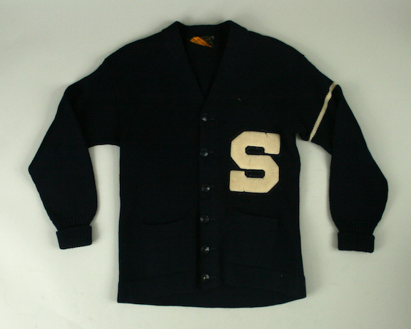 Description:Vintage Penn State letterman sweater, c.1930s. (EX) The Standard Pennant Co size 40 button-up sweater featuring a white "S" patch sewn on front. "Richard Jones" embroidered name tag is sewn inside the side tail. Exhibits light overall age wear: EX