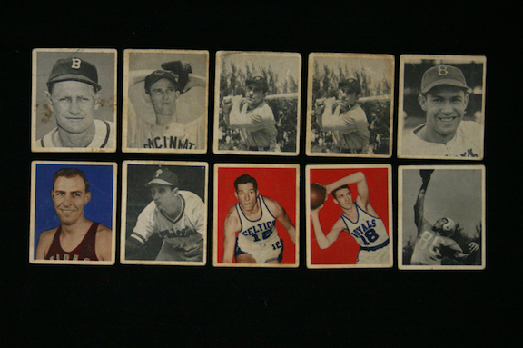 Description:Lot of (10) Bowman baseball, basketball, and football cards with (2) Yogi Berra. (PR-VG) Incl. (6) 1948 Bowman Baseball cards with #s 1 Elliott (PR), 2 Blackwell (VG appearance, but pencil marking on back), (2) 6 Berra (FR-FR/GD, pencil markings on backs), 7 Reiser (VG appearance, but pencil marking on back), and 24 Leonard (VG appearance, but pencil marking on back); (3) 1948 Bowman Basketball cards with #s 40 Miasek (VG), 57 Spector (VG), 58 Risen (VG); and 1948 Bowman Football #47 Mann (VG). Range: PR-VG