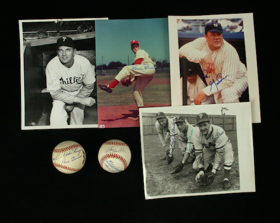 Description:Lot of (12) single and multi signed baseball items, with Jim Konstanty. (VG/EX-NM) Incl. W.White NL ball signed by Mike Schmidt, Eddie Mathews, and Harmon Killebrew; W.White NL ball signed by Dallas Green, Paul Owens, and Eddie Sawyer; B.Selig ML ball signed by Don Larsen (TRI-STAR); 8"x10" photo signed by Jim Konstanty (personalized "Best Wishes To Dave", VG/EX due to wear along top edge); 8"x10" photo signed by Robin Roberts; 8"x10" photo signed by John Goodman as "The Babe"; UPI press photo signed by Roy Cullenbine, Eddie Miller, and Bert Haas; 1985 Wheaties Pete Rose poster signed by Pete Rose; Philadelphia Phillies poster signed by Dallas Green; 4"x6" photo signed by Mickey Morandini; 4"x6" photo signed by Danny Cox; and 4"x6" photo signed by Jose DeJesus. Signatures rate 8 to 9/10 out of 10: VG/EX-NM