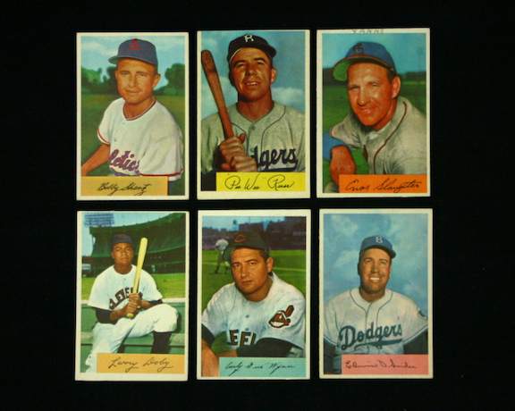 Lot of (76) 1954 Bowman Baseball cards, with some HOFers. (PR-EX/MT) Incl. #s 7, 10, 12, 14, 17, 19, 20, 21, 26, 30, 35, 36, 37, 38, 39, 42, 44, 49, 51, 52, 53, 54, 58 Pee Wee Reese (VG/EX oc), 60, 62 Enos Slaughter (PR due to pencil notation), 68, 71, 74, 78, 84 Larry Doby (VG/EX oc), 86, 87, 88, 99, 100, 101, 106, 108, 115, (2) 122, 124, 129, 130, 131, (2) 133, (2) 134, (2) 135, 136, 142, 146, 147, 148, 149, 151, 154, 162, 163, 164 Early Wynn (VG/EX oc), 165, 166, 167, 170 Duke Snider (VG), 172, 174, 179, 186, 202, (2) 204, 211, 215, 218. Most appear to grade VG overall, with (7) having pencil notations. Range: PR-EX/MT