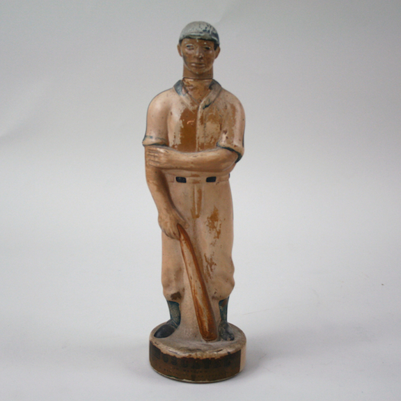 Description:Vintage figural baseball player Moscatel liquor bottle, c.1930s-40. (VG) 12.5" glass bottle made in the figure of a baseball player. Base is labeled "MOSCATEL" "DE SITGES" "S.A. REGAS - GERONA (ESPANA)". Exhibits moderate age wear, with areas of paint loss. Glass head is still present: VG