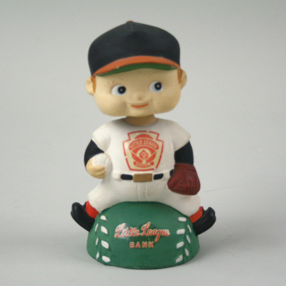 Description:Vintage Little League nodder bank by Lego, c.1960s. (VG/EX) 6" nodder with Little League Baseball logo decal on jersey, "Little League Bank" decal on base, and number "4" decal on back of jersey. Underside of base is marked "LEGO". Exhibits light to moderate age wear, with a hairline crack on front of face, and cracking to underside of head: VG/EX