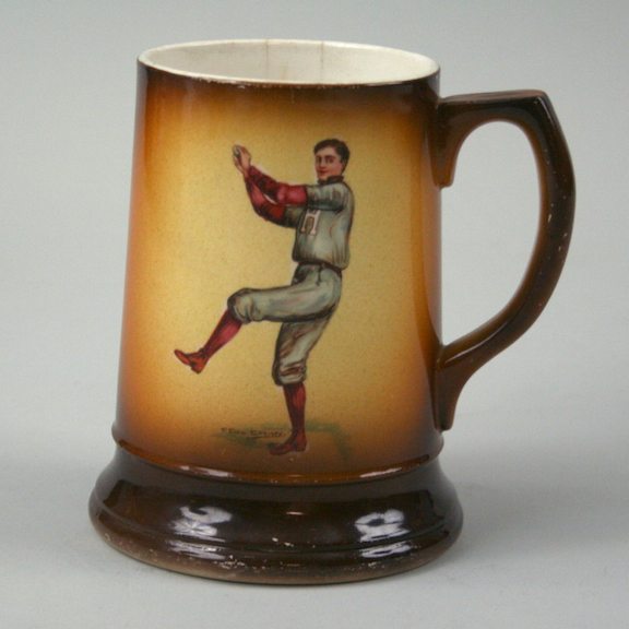 Description:Vintage Harvard baseball porcelain mug, c.1910s. (EX) 5.25" tall, features a colorful image of a Harvard baseball pitcher on one side with Harvard shield on other side. "Avon" "W P. Co" marking is on underside of mug. Exhibits light to moderate age wear, with two small hairline cracks, and areas of crazing present: EX