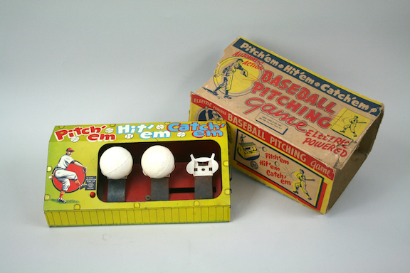Description:Vintage Marx "Baseball Pitching Game" in original box, c.1950's. (VG-EX) Tin lithographic electric toy by Louis Marx & Co. shows light to moderate usage wear, with two plastic baseballs still present. Original box features colorful baseball graphics and shows heavy wear: Game: EX, Box: VG