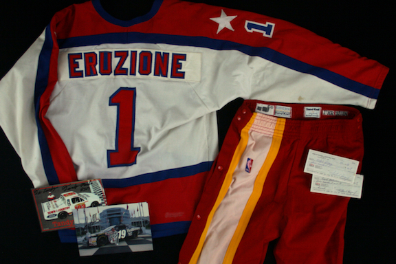 Description:Lot of assorted sports memorabilia and autographs. (VG/EX-NM) Incl. c.1980s professional model Atlanta Hawks warm-up pants (EX, light usage wear); Cooper size L Team USA #1 hockey jersey with "ERUZIONE" nameplate sewn on back (VG/EX, usage wear); 2002 Daytona 500 program and tickets. Autographs include Detroit Lions mini helmet signed by Dick Night Train Lane; Frank Robinson signed check; Ralph Branca signed check; and NASCAR autographs including Michael Waltrip, Harry Gant, Geoff Bodine, and others. Signatures rate 8 to 9/10 out of 10: VG/EX-NM
