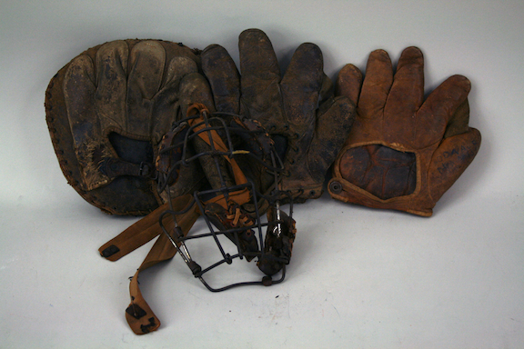 Vintage catcher's mask, and (3) vintage baseball gloves, c.1900-1920s. (VG) Incl. c.1900 catcher's mask; c.1910s Spalding fielder's glove; c.1910s fielder's glove (unknown maker, name written on glove); and c.1920s Reach catcher's mitt. Each items exhibits moderate to heavy usage wear: VG