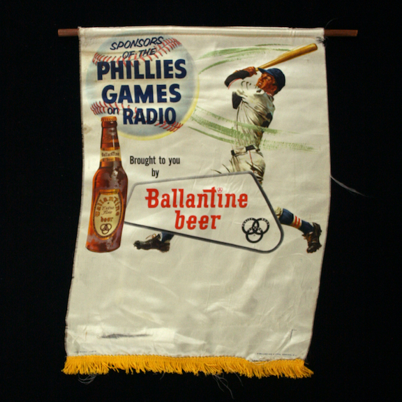Description:Vintage Philadelphia Phillies Ballantine Beer silk banner, c.1950s. (VG/EX) 13"x19" banner advertising Ballantine Beer as sponsors of the Phillies games on radio. Exhibits moderate age wear with tearing where the banner meets the tassels: VG/EX