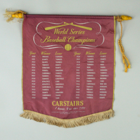 Description:Vintage Carstairs World Series Champions silk banner, c.1952. (EX) 14"x17" banner listing all World Series champions from 1920-1951. Carstairs whiskey advertising is present at bottom of banner. Exhibits light to moderate age and handling wear: EX