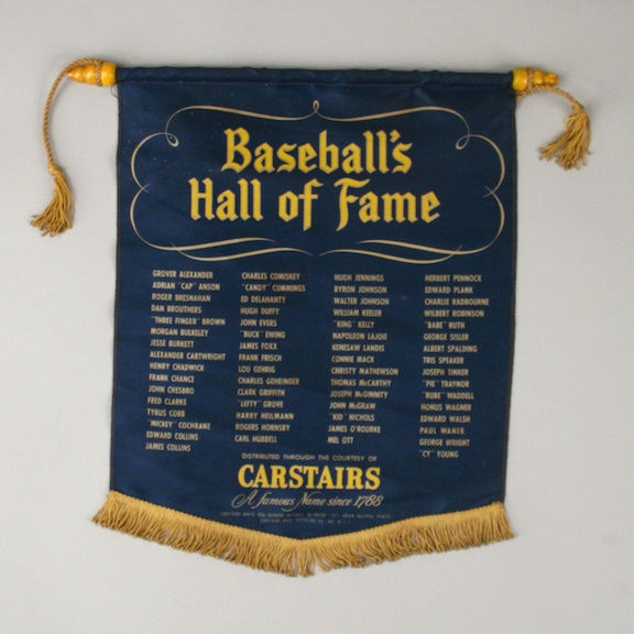 Description:Vintage Carstairs Baseball's Hall of Fame silk banner, c.1952. (EX) 14"x18" banner listing all HOF members up to 1952. Carstairs whiskey advertising is present at bottom of banner. Exhibits light age and handling wear: EX