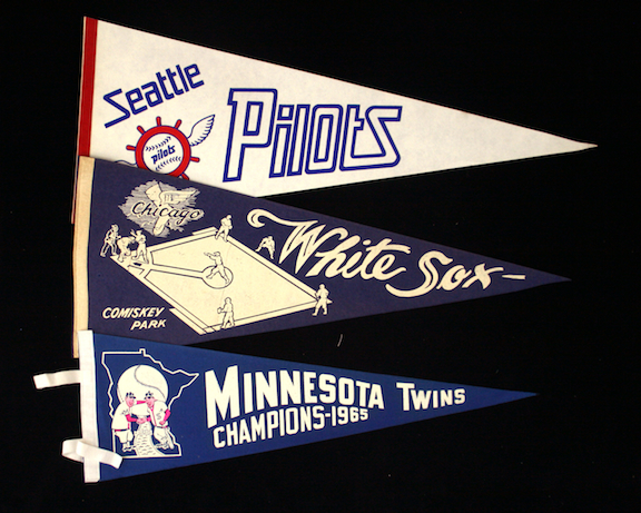 Description:Chicago White Sox, Minnesota Twins, and Seattle Pilots pennants, c.1950s-1969. (EX-NM) Includes c. late 1950s 29" White Sox pennant (EX); 1965 26.5" Twins champions pennant (EX/MT); and c.1969 30" Pilots pennant (EX/MT-NM). Range: EX-NM