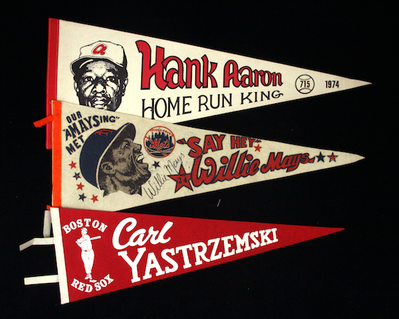 Description:Hank Aaron, Willie Mays, and Carl Yastrzemski pennants, c.1970s. (VG/EX-NM) Incl. 30" Hank Aaron Home Run King pennant (EX); 28.5" Willie Mays Mets pennant (VG/EX, cut tassels); and 26.5" Carl Yastrzemski pennant (NM appearance, but adhesive residue on back). Range: VG/EX-NM