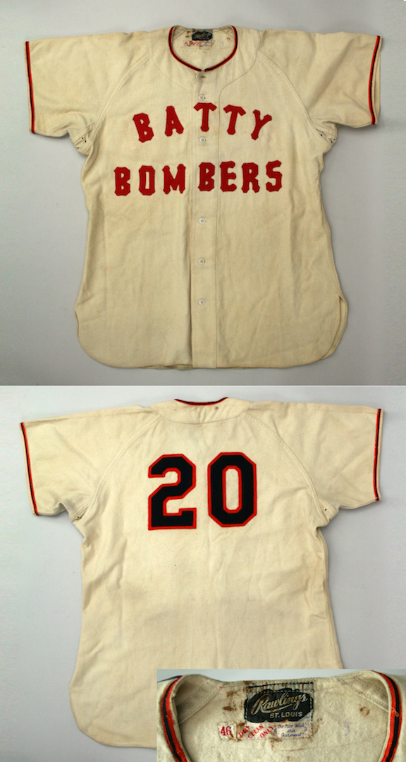 Description:New York Giants #20 professional model jersey c.1949-50 ("GIANTS" lettering removed from front, EX). Heaby flannel button down jersey retaining its original "20" on the back. The "GIANTS" lettering on the front was removed and replaced with "Batty Bombers" red lettering. The outline of the "GIANTS" lettering is still visible. Original Rawlings size 46, "Dry Clean Only", and "Do Not Wash this Garment" tagging remain in the collar. A faint "5" is written in ink next to the Rawlings tagging. Jersey exhibits moderate usage and wash wear: EX