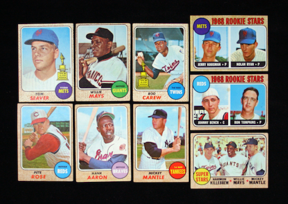 1968 Topps Baseball complete (598)-card set (GD-NM). Key cards grade: #s 45 Seaver (EX/MT), 50 Mays (VG/EX-EX), 80 Carew (EX miscut), 110 Aaron (EX), 150 Clemente (trimmed, ink notation on back), 177 Ryan (EX/MT miscut), 230 Rose (EX), 247 Bench (VG/EX-EX, light brown spot on front), 280 Mantle (VG-VG/EX), 330 Maris (VG/EX), 490 Super-Stars (EX), and 480 Manager's Dream (GD). Set grades EX-EX/MT overall. Range GD-NM
