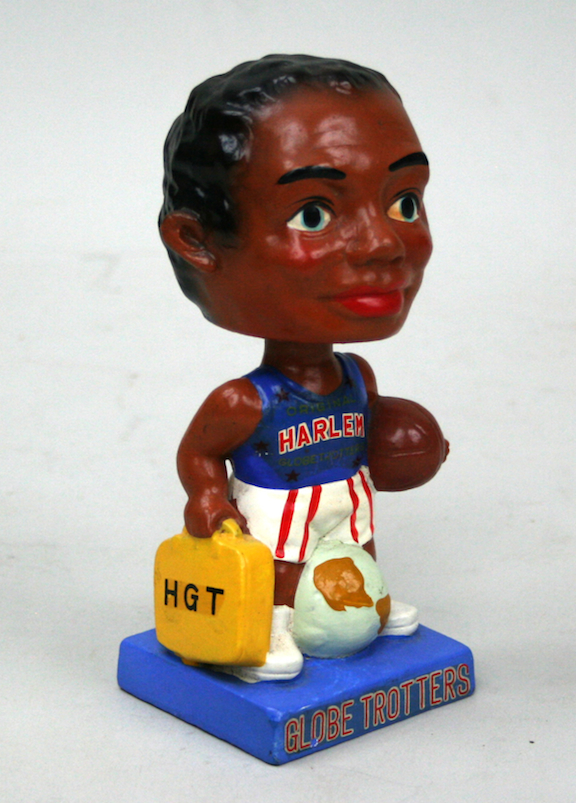 Description:High grade Harlem Globe Trotters bobble head c.1962 (NM). Square based nodder stamped "1962 Exclusive License Rights Japan" on the bottom. Exhibits virtually no wear except for a very small spot of loss to the "O" in "GLOBE" on the base decal: NM