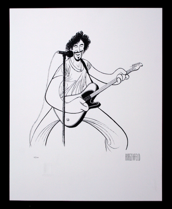 Description:CORRECTED: "Bruce Springsteen" limited edition lithograph by Al Hirschfeld (NM). 16"x20" litho depicting Springsteen playing the guitar and singing into a mic. ***The litho is plate signed by the artist, Al Hirschfeld (it is not signed in pencil as originally described)***. Limited edition hand #ed 19/100: NM