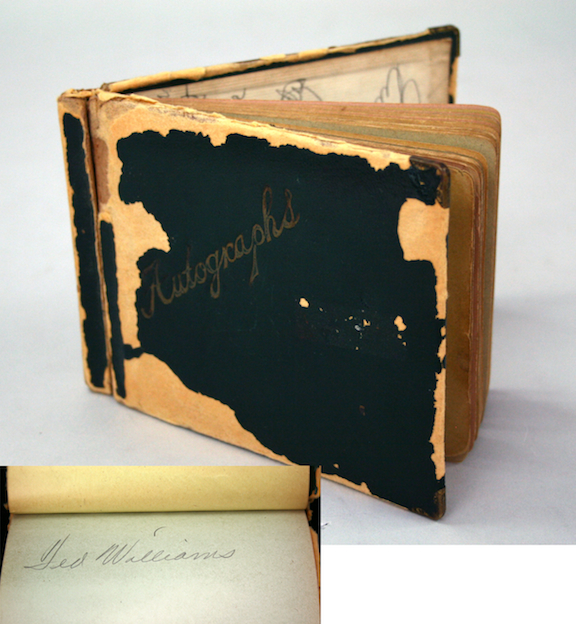 Description:Vintage 1940s baseball autograph album containing (297) signatures including Klein, Williams, and Bengough (EX-EX/MT overall). Album measures 5"x6" (album sheets measure 4.5"x6"). Signatures include: Chuck Klein, Ted Williams (single-signed sheet), Benny Bengough, Clark Griffith, Charlie Gehringer, Danny Murtaugh, Red Ruffing, Lloyd Waner, Dutch Leonard, Bob Feller, Joe Cronin, Schoolboy Rowe, Lefty Gomez, Sid Hudson, Lou Boudreau, Beau Bell, Rollie Hemsley, Tom Henrich, Mickey Vernon, Sam West, Steve Sundra, George Case, Dizzy Trout, Hal Newhouser, Rudy York, Tom Bridges, Luke Sewell, Denny Galehouse, Ossie Bluege, George Archie, Joe Haynes, Al Evans, Don Kolloway, Skeeter Webb, Luke Appling, Myril Hoag, Pete Suder, Dick Siebert, Pete Fox, Dom DiMaggio, Stan Spence, Early Wynn, Chubby Dean, Ken Keltner, Hans Lobert, Joe Judge, Mickey Vernon, Andy Seminick, Bill Wright, Ralph Kiner, and others. A few players signed the album multiple times. Majority of the signatures are in pencil and rate 8-10 out of 10 on average. The album exhibits heavy wear to the cover which does not effect the signed pages within: EX-EX/MT