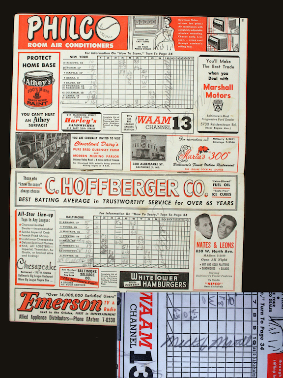 Description:Vintage Mickey Mantle et. al. multi-signed 1954 Baltimore Orioles vs. New York Yankees Scorecard (EX). Original Orioles vs. Yankees program/scorecard signed by (4) n the interior including Mickey Mantle, Phil Rizzuto, Allie Reynolds, and Bobby Brown. All are signed in pencil except for Brown (ink). Vintage ink signatures rate 9 out of 10. Scorecard is filled out in pencil. Exhibits light handling wear: EX