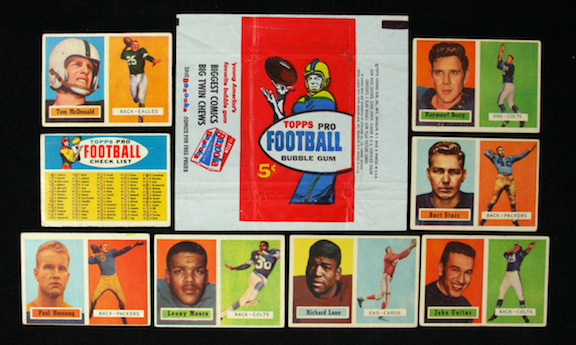1957 Topps Football card complete (155)-card set with pack wrapper (VG-EX/MT). Key cards grade: #s 1 LeBaron (VG), 30 Tittle (VG/EX), 31 Blanda (EX), 32 Layne (EX), 85 Lane (EX), 88 Gifford (EX, wax stain on back), 94 Berry (VG), 104 Morrall (VG/EX), 119 Starr (VG/EX, miscut back), 124 McDonald (VG), 128 Moore (EX), 138 Unitas (VG/EX, wax stain on back), 151 Hornung (VG/EX miscut), 154 Morrison (VG/EX stain), and Checklist (GD, marked in pencil). Also includes a 1957 Topps wax pack wrapper (EX). Set grades VG/EX-EX overall. Range VG-EX/MT