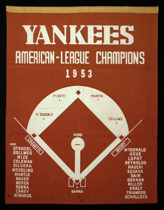 Description:1953 New York Yankees American-League Champions 18"x23" banner pennant (EX). Original felt banner pennant which reads "YANKEES AMERICAN-LEAGUE CHAMPIONS 1953" at the top and depicts a baseball field with the team members' last names listed beneath. Displays well overall and exhibits light wear including some pinholing around the edges. There is some brown spotting where the pins were: EX