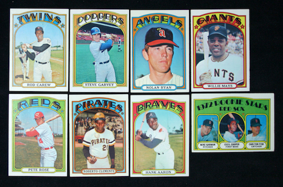 1972 Topps Baseball complete (787)-card set (VG/EX-NM). Key cards grade: #s 49 Mays (EX/MT), 79 Fisk (EX), 299 Aaron (EX/MT), 309 Clemente (EX/MT), 559 Rose (EX/MT), 595 Ryan (EX/MT (OC)), 686 Garvey (EX (OC)), and 695 Carew (EX/MT). Set grades EX-EX/MT overall. Range VG/EX-NM