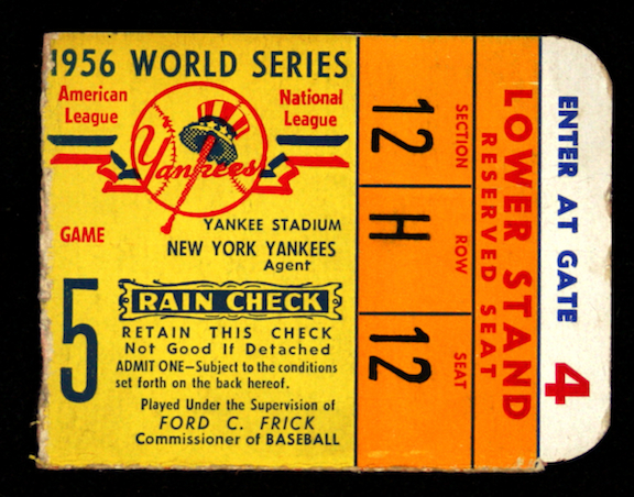 Description:1956 World Series Game 5 "Don Larsen Perfect Game" ticket stub (VG/EX). Original stub from game 5 of the 1956 World Series played at Yankee Stadium. Exhibits light edge wear and has a light horizontal crease on the right side. Clean front and back: VG/EX