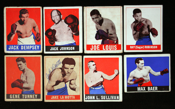1948 Leaf Boxing complete (49)-card set (GD-EX). Key cards garde: #s 1 Dempsey (VG), 9 Jeffries (EX), 17 Johnson (VG/EX), 25 Attell (VG-VG/EX), 32 Schmeling (VG/EX-EX), 38 Sharkey (VG-VG/EX), 48 Louis (GD), 55 Corbett (EX), 63 Fitzsimmons (VG), 64 Robinson (EX), 73 Tunney (VG/EX), 93 Baer (VG/EX), 101 Sullivan (EX), and 102 LaMotta (signed by LaMotta in blue ink, VG/EX). Set grades VG/EX overall. Range GD-EX