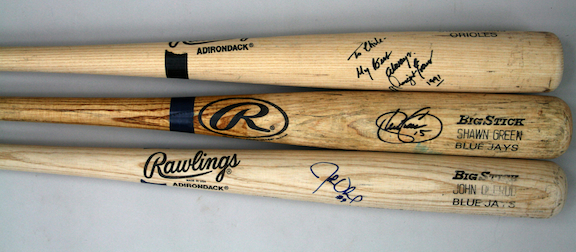 Description:**UPDATED** The minimum bid/reserve on this lot has been amended to $150. Dwight Evans, Shawn Green, and John Olerud signed professional model baseball bats c.1991-1999 (EX-EX/MT).Includes: 1991 Dwight Evans 34 1/4" Rawlings Adirondack 430F model bat with "24" written on the knob. Bat exhibits scattered surface marks. Evans signed the bat in black marker and personalized it "To Chili - My Best Always - 1991". Signature rates 9 out of 10; 1994 John Olerud 35" Rawlings Adirondack 433B model bat with "9" written on the knob end. Bat exhibits a few surface marks. Olerud signed the bat in blue sharpie. Signature rates 8 out of 10; and a 1999 Shawn Green Rawlings Adirondack 456B model bat with "15" written on the knob end. Bat exhibits heavy usage wear including multiple ball and rack marks. Green signed the bat in black marker. Signature rates 8 out of 10. Includes a Letter of Provenance signed by Chili Davis stating that this lot originated from his personal collection: EX-EX/MT
