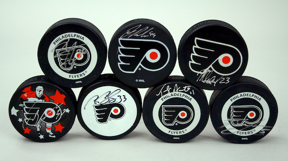 Description:Lot of (7) single-signed Philadelphia Flyers hockey pucks (EX-NM). Incl. Tony Amonte; Craig Berube; Brian Boucher; Braydon Coburn; Joni Pitkanen; Darroll Powe; and Alex Zhamnov. Signatures rate 7 to 9 out of 10: EX-NM