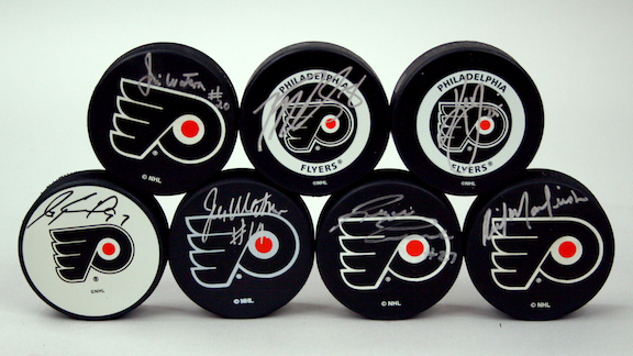 Description:Lot of (7) single-signed Philadelphia Flyers hockey pucks (EX/MT-NM). Incl. Reggie Leach; Rick MacLeish; Keith Primeau; Mike Richards; Jeremy Roenick; Joe Watson; and Jim Watson. Signatures rate 7 to 9 out of 10: EX/MT-NM