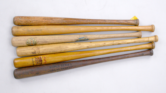 Description:Lot of (6) vintage souvenir mini bats, c.1930s-1950s (GD-EX). Incl. 18" 1932 World Series Cubs vs Yankees mini bat (EX); 18" Detroit Tigers mini decal bat (EX); 18" Detroit Tigers mini bat (EX); 16" St. Louis Cardinals mini bat (GD); 18" New York Yankees mini bat (VG); and 16.5" Buffalo Bison's mini decal bat (VG/EX). Range: GD-EX