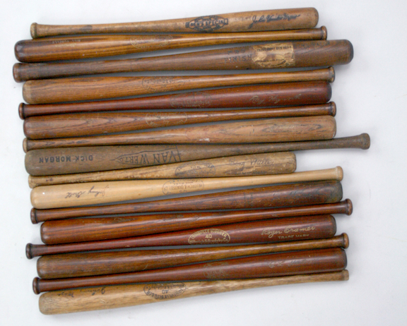 Description:Lot of (16) vintage baseball player mini bats, c.1920s-1950s (G/VG-EX). Incl. c.1920s Gene Valla mini decal bat (VG/EX); c.1930s Gabby Hartnett mini bat (EX); c.1930s Bing Miller mini bat (VG); c.1930s Dick Morgan mini bat (VG/EX); c.1930s Ray Hayworth mini bat (EX); 1939 Joe Hauser mini bat (VG); c.1940s Hank Greenberg mini bat (VG); c.1940s Johnny Mize mini bat (G/VG); c.1940s Enos Slaughter mini bat (G/VG); c.1940s Roger Cramer mini bat (EX); c.1940s Stan Hack mini bat (G/VG); c.1940s George Pfister mini bat (VG/EX); c.1940s Aaron Robinson mini bat (VG); c.1940s John Vander Meer mini bat (EX); c.1940s Bill Voselle mini bat (EX); and c.1950s Johnny Groth mini bat (EX). Range: G/VG-EX