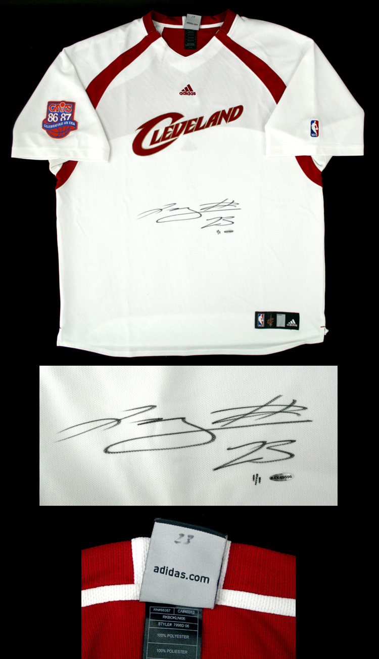 Description:LeBron James Autographed Game Used Cleveland Cavaliers White Shooting Shirt UDA 1 of 1 (EX/MT). White and red pull over shirt with Adidas logo and "CLEVELAND" on front, "86-87 CAVS - Celebrating An Era" patch on the right sleeve, NBA logo on left sleeve, Cavaliers and Adidas logos on back. In the collar are Adidas and 3XL tagging. The Adidas tag has "23" written in black marker on both sides. Adidas/Cavaliers tag appears on the front lower left. Shirt has been signed by LeBron James in black marker across the front with "23" inscription. Signature rates 8/9 out of 10. Limited edition hand #ed 1/1. Exhibits usage wear. Includes Upper Deck Authenticated COA and box (UDA serial #ed hologram is affixed to the shirt): EX/MT