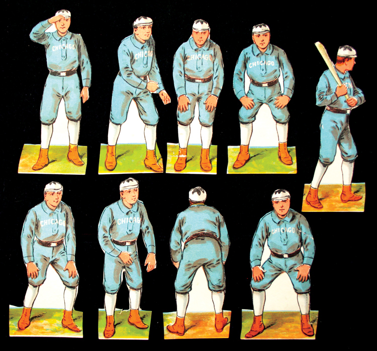 Description:Lot of (9) "Chicago" baseball player die-cut games pieces c.1890s (EX-EX/MT). Set of colorful 4.5" to 5" tall baseball player die-cuts, presumably issued for used as part of a period game. Heavy paper stock exhibits minimal age toning with hand cut edges neatly accomplished. Very light surface wear with (3) pieces having small tear or surface imperfection: Range EX-EX/MT