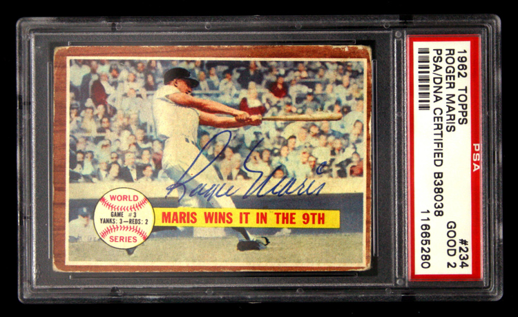 Description:Roger Maris signed 1962 Topps #234 card PSA/DNA (GD). Maris signed the card in blue ink. Signature rates 9 out of 10. The card exhibits rounded corners and edge wear. Authenticated and encapsulated by PSA/DNA. Card is graded PSA 2: GD