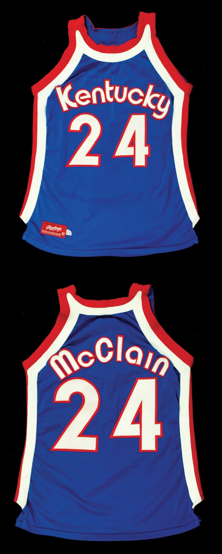 Description:1974-75 Ted McClain World Champion Kentucky Colonels professional model jersey (EX). Extremely rare style as worn during the 1974-75 Championship season comprised of blue mesh with red and white trim. Team name "Kentucky" spans the front above player number "24." Name "McClain" on back above number. "Rawlings" manufacturer's tag on front tail with size "42" and adjacent "1 Inch Extra Length" flag tag. Exhibits moderate usage wear. Includes LOA from Hunt Auctions: EX