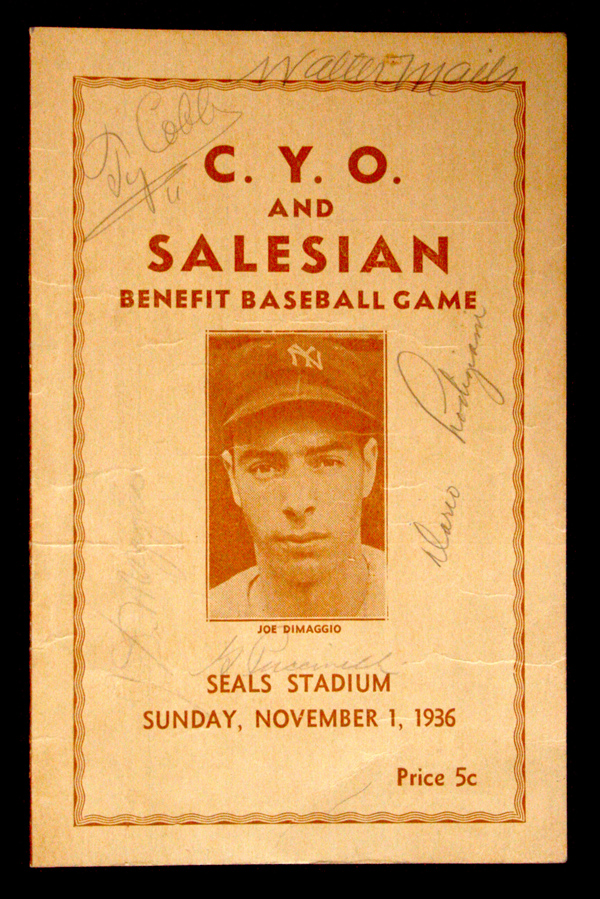 Description:Ty Cobb & Joe DiMaggio signed 1936 Benefit Baseball Game program (VG/EX). Original November 1, 1936 "C.Y.O. and Salesian Benefit Baseball Game" program featuring the All-Star Italians vs. the All-Star Nations at Seals Stadium. The cover is signed by (5) including Ty Cobb, Joe DiMaggio, Walter Mails, George Puccinelli, and Dario Lodigiani. The pencil signatures, which were signed at the time of the event, rate 9 out of 10 except for DiMaggio, which is a little lighter rating 6/7 out of 10. The inner scorecard is unused and features printed lineups. The All-Star Italians lineup includes DiMaggio, Lavagetto, Lazzeri, and Lombardi. The All-Star Nations lineup includes Hafey, Dahlgren, Galan, and Bartell. Program exhibits creasing throughout from handling, but displays as VG/EX overall. Includes an auction LOA from JSA.