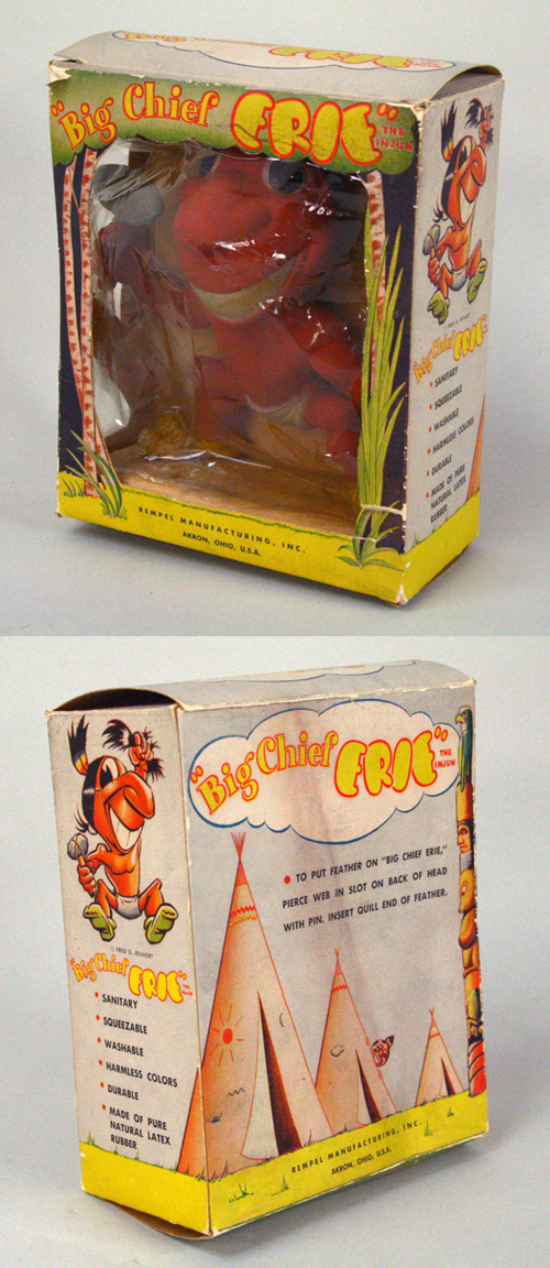 Description:Vintage Rempel "Big Chief Erie" Cleveland Indians mascot squeeze toy in original box c.1950 (EX). Rare item to find with its original box. Produced by Rempel Manufacturing, Inc. in the late 1940s to early 1950s. The squeeze toy measures 6" tall and remains in like new condition exhibiting minimal wear. Box features color graphics and lettering including "Big Chief Erie - The Injun", tipi graphics on the back, and a depiction of the doll on one side. Box exhibits light to moderate wear including some tearing on the left side and a tear on the right front. The plastic has come loose and exhibits some tearing. Squeeze toy: EX/MT-NM; Box: VG/EX