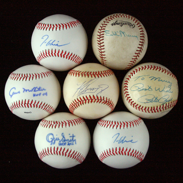 Description:Lot of (7) star and HOFer single-signed baseballs (VG-NM). Incl. Rawlings Official League ball signed by Paul Molitor with "HOF 04" inscription; W.White NL ball (VG, usage wear) signed by Eddie Murray; Rawlings Official League ball signed by Ozzie Smith with "HOF 2002" inscription; C.Feeney NL ball (toning) signed by Pete Rose (personalized); B.Brown AL ball (toning) signed by Ken Griffey Jr; and (2) Official League balls signed by Tom Glavine. Signatures rate 7/8 to 9/10 out of 10: VG-NM
